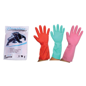 PANTHER HOUSE HOLD RUBBER HAND GLOVES COLOUR: BLUE / GREEN / PINK / RED / YELLOW SIZES: SMALL, MEDIUM, LARGE & EX - LARGE (GRIP ON PALM) LENGTH: 300 MM CUFF: CUT / ROLLED